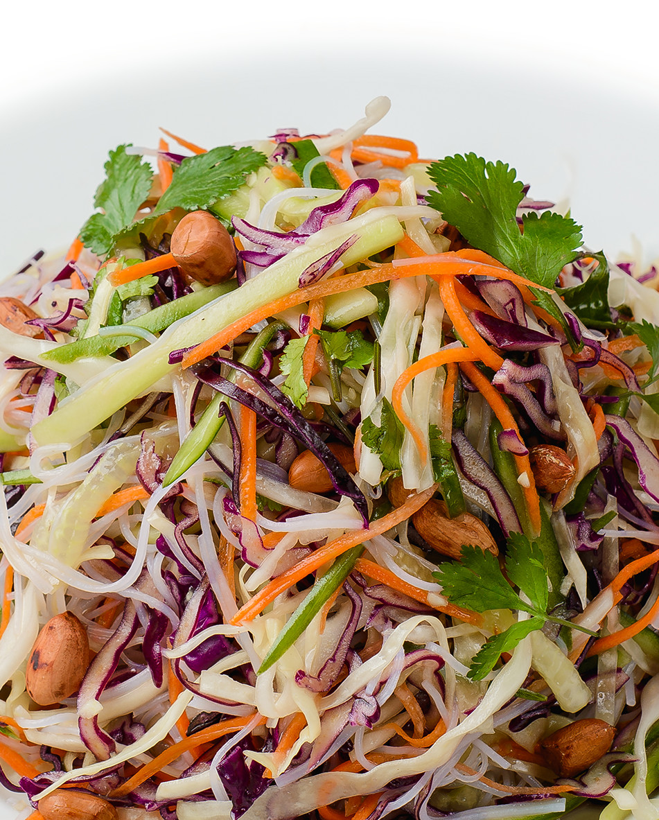Самый популярный салат в северо-восточной кухни – «Харбин». В основе блюда овощи: огурец, морковь и капуста, нарезанные тонкой соломкой с добавлением стеклянной лапши фунчозы. Салат приправлен кисло-сладким соусом.
